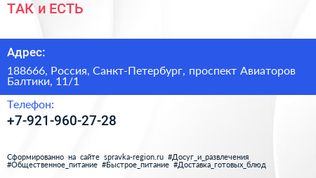 ТАК и ЕСТЬ по адресу 188666, Россия, Санкт-Петербург, проспект Авиаторов Балтики, 11/1 в дальнейшем Организация, размещена в следующих категориях: