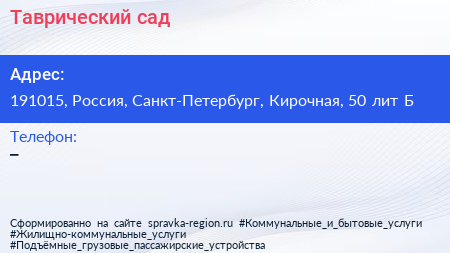 Таврический сад по адресу 191015, Россия, Санкт-Петербург, Кирочная, 50 лит Б в дальнейшем Организация, размещена в следующих категориях: