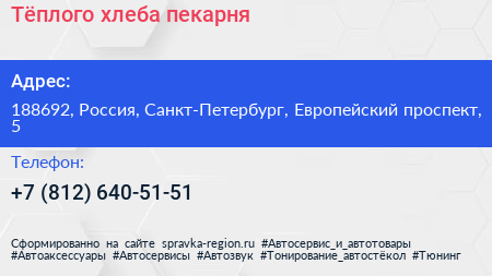 Тёплого хлеба, пекарня по адресу 188692, Россия, Санкт-Петербург, Европейский проспект, 5 в дальнейшем Организация, размещена в следующих категориях: