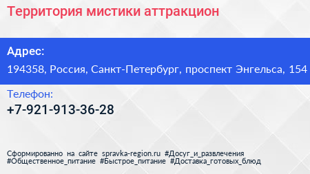 Территория мистики, аттракцион по адресу 194358, Россия, Санкт-Петербург, проспект Энгельса, 154 в дальнейшем Организация, размещена в следующих категориях: