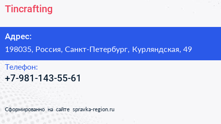Tincrafting по адресу 198035, Россия, Санкт-Петербург, Курляндская, 49 в дальнейшем Организация, размещена в следующих категориях: