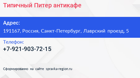 Типичный Питер, антикафе по адресу 191167, Россия, Санкт-Петербург, Лаврский проезд, 5 в дальнейшем Организация, размещена в следующих категориях: