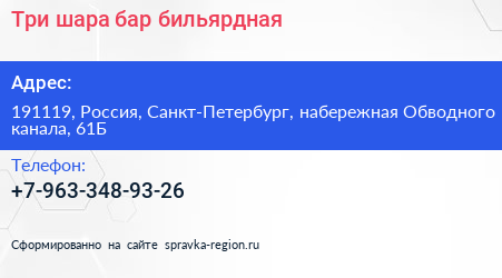 Три шара, бар-бильярдная по адресу 191119, Россия, Санкт-Петербург, набережная Обводного канала, 61Б в дальнейшем Организация, размещена в следующих категориях: