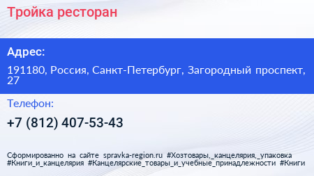 Тройка, ресторан по адресу 191180, Россия, Санкт-Петербург, Загородный проспект, 27 в дальнейшем Организация, размещена в следующих категориях: