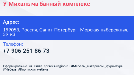 У Михалыча, банный комплекс по адресу 199058, Россия, Санкт-Петербург, Морская набережная, 39 к3 в дальнейшем Организация, размещена в следующих категориях: