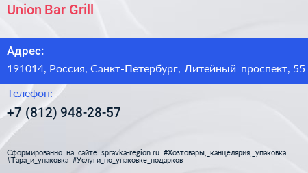 Union Bar & Grill по адресу 191014, Россия, Санкт-Петербург, Литейный проспект, 55 в дальнейшем Организация, размещена в следующих категориях: