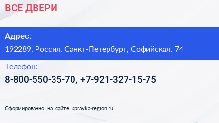ВСЕ ДВЕРИ по адресу 192289, Россия, Санкт-Петербург, Софийская, 74 в дальнейшем Организация, размещена в следующих категориях: