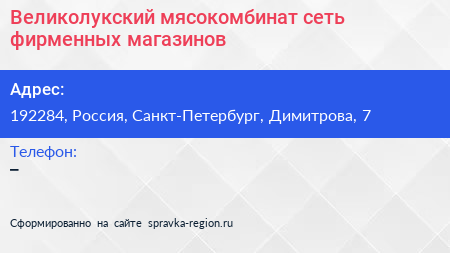 Великолукский мясокомбинат, сеть фирменных магазинов по адресу 192284, Россия, Санкт-Петербург, Димитрова, 7 в дальнейшем Организация, размещена в следующих категориях: