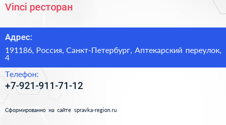Vinci, ресторан по адресу 191186, Россия, Санкт-Петербург, Аптекарский переулок, 4 в дальнейшем Организация, размещена в следующих категориях:
