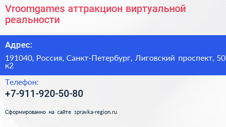 Vroomgames, аттракцион виртуальной реальности по адресу 191040, Россия, Санкт-Петербург, Лиговский проспект, 50 к2 в дальнейшем Организация, размещена в следующих категориях: