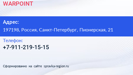 WARPOINT по адресу 197198, Россия, Санкт-Петербург, Пионерская, 21 в дальнейшем Организация, размещена в следующих категориях: