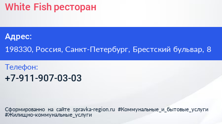 White Fish, ресторан по адресу 198330, Россия, Санкт-Петербург, Брестский бульвар, 8 в дальнейшем Организация, размещена в следующих категориях: