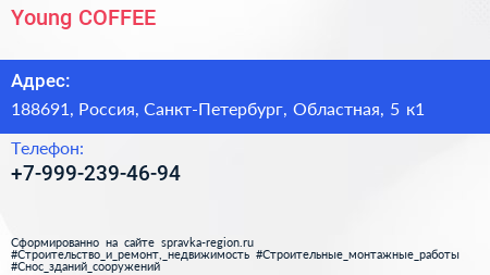 Young COFFEE по адресу 188691, Россия, Санкт-Петербург, Областная, 5 к1 в дальнейшем Организация, размещена в следующих категориях: