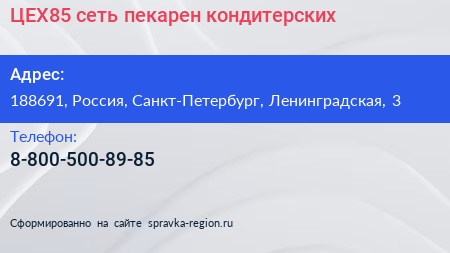 ЦЕХ85, сеть пекарен-кондитерских по адресу 188691, Россия, Санкт-Петербург, Ленинградская, 3 в дальнейшем Организация, размещена в следующих категориях: