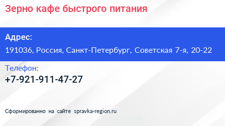 Зерно, кафе быстрого питания по адресу 191036, Россия, Санкт-Петербург, Советская 7-я, 20-22 в дальнейшем Организация, размещена в следующих категориях: