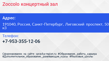 Zoccolo, концертный зал по адресу 191040, Россия, Санкт-Петербург, Лиговский проспект, 50 к3 в дальнейшем Организация, размещена в следующих категориях: