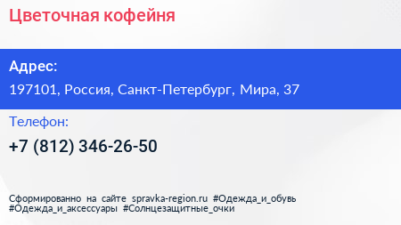 Цветочная кофейня по адресу 197101, Россия, Санкт-Петербург, Мира, 37 в дальнейшем Организация, размещена в следующих категориях: