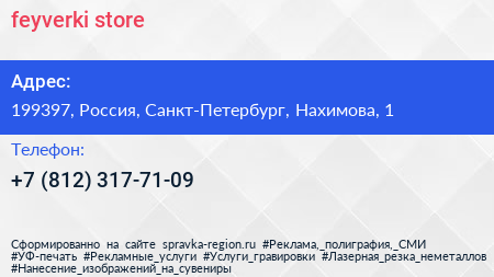 feyverki.store по адресу 199397, Россия, Санкт-Петербург, Нахимова, 1 в дальнейшем Организация, размещена в следующих категориях: