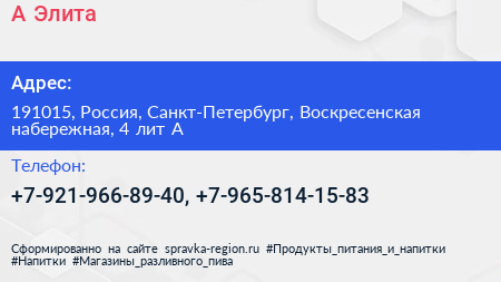 А-Элита по адресу 191015, Россия, Санкт-Петербург, Воскресенская набережная, 4 лит А в дальнейшем Организация, размещена в следующих категориях: