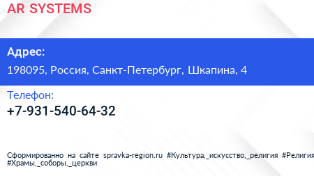 AR-SYSTEMS по адресу 198095, Россия, Санкт-Петербург, Шкапина, 4 в дальнейшем Организация, размещена в следующих категориях: