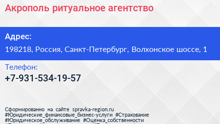 Акрополь, ритуальное агентство по адресу 198218, Россия, Санкт-Петербург, Волхонское шоссе, 1 в дальнейшем Организация, размещена в следующих категориях: