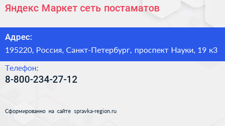 Яндекс.Маркет, сеть постаматов по адресу 195220, Россия, Санкт-Петербург, проспект Науки, 19 к3 в дальнейшем Организация, размещена в следующих категориях: