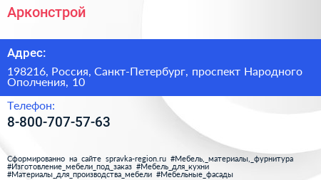 Арконстрой по адресу 198216, Россия, Санкт-Петербург, проспект Народного Ополчения, 10 в дальнейшем Организация, размещена в следующих категориях: