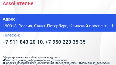 Assol, ателье по адресу 190013, Россия, Санкт-Петербург, Клинский проспект, 11 в дальнейшем Организация, размещена в следующих категориях: