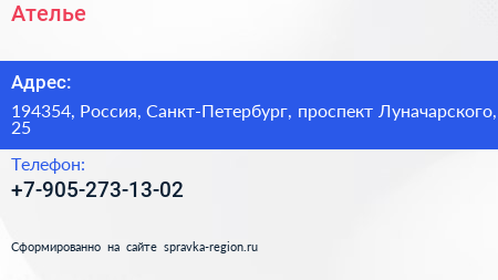 Ателье по адресу 194354, Россия, Санкт-Петербург, проспект Луначарского, 25 в дальнейшем Организация, размещена в следующих категориях: