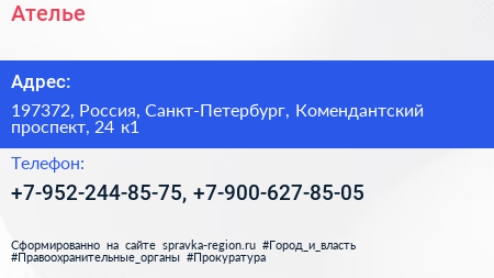 Ателье по адресу 197372, Россия, Санкт-Петербург, Комендантский проспект, 24 к1 в дальнейшем Организация, размещена в следующих категориях: