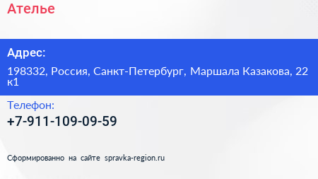 Ателье по адресу 198332, Россия, Санкт-Петербург, Маршала Казакова, 22 к1 в дальнейшем Организация, размещена в следующих категориях: