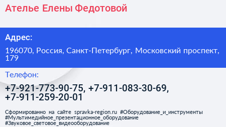 Ателье Елены Федотовой по адресу 196070, Россия, Санкт-Петербург, Московский проспект, 179 в дальнейшем Организация, размещена в следующих категориях: