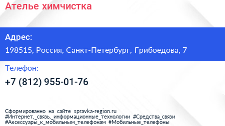 Ателье-химчистка по адресу 198515, Россия, Санкт-Петербург, Грибоедова, 7 в дальнейшем Организация, размещена в следующих категориях: