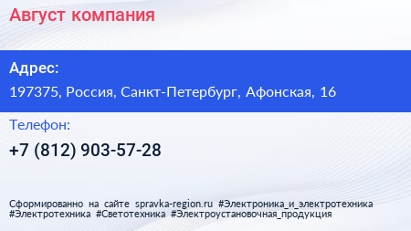 Август, компания по адресу 197375, Россия, Санкт-Петербург, Афонская, 16 в дальнейшем Организация, размещена в следующих категориях: