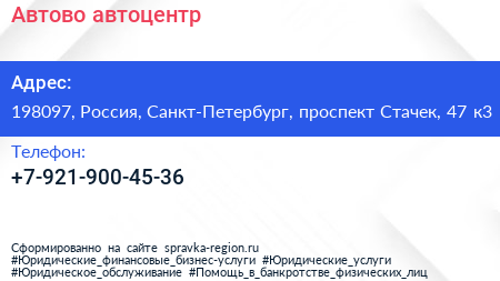 Автово, автоцентр по адресу 198097, Россия, Санкт-Петербург, проспект Стачек, 47 к3 в дальнейшем Организация, размещена в следующих категориях:
