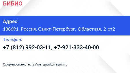БИБИО по адресу 188691, Россия, Санкт-Петербург, Областная, 2 ст2 в дальнейшем Организация, размещена в следующих категориях: