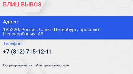 БЛИЦ ВЫВОЗ по адресу 195220, Россия, Санкт-Петербург, проспект Непокорённых, 49 в дальнейшем Организация, размещена в следующих категориях: