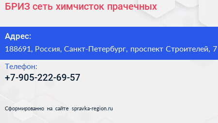 БРИЗ, сеть химчисток-прачечных по адресу 188691, Россия, Санкт-Петербург, проспект Строителей, 7 в дальнейшем Организация, размещена в следующих категориях: