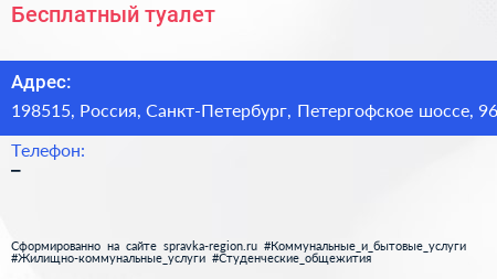 Бесплатный туалет по адресу 198515, Россия, Санкт-Петербург, Петергофское шоссе, 96 в дальнейшем Организация, размещена в следующих категориях: