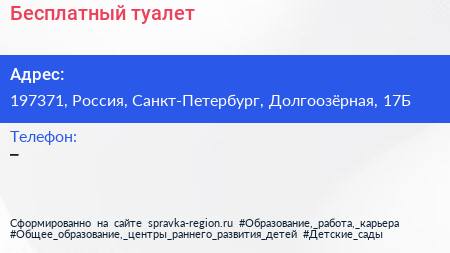 Бесплатный туалет по адресу 197371, Россия, Санкт-Петербург, Долгоозёрная, 17Б в дальнейшем Организация, размещена в следующих категориях:
