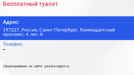 Бесплатный туалет по адресу 197227, Россия, Санкт-Петербург, Комендантский проспект, 4 лит А в дальнейшем Организация, размещена в следующих категориях: