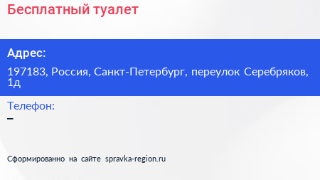 Бесплатный туалет по адресу 197183, Россия, Санкт-Петербург, переулок Серебряков, 1д в дальнейшем Организация, размещена в следующих категориях: