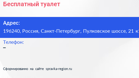 Бесплатный туалет по адресу 196240, Россия, Санкт-Петербург, Пулковское шоссе, 21 к1 в дальнейшем Организация, размещена в следующих категориях: