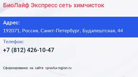БиоЛайф-Экспресс, сеть химчисток по адресу 192071, Россия, Санкт-Петербург, Будапештская, 44 в дальнейшем Организация, размещена в следующих категориях: