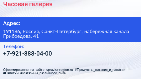 Часовая галерея по адресу 191186, Россия, Санкт-Петербург, набережная канала Грибоедова, 41 в дальнейшем Организация, размещена в следующих категориях: