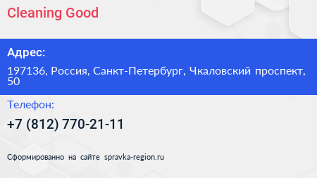 Cleaning Good по адресу 197136, Россия, Санкт-Петербург, Чкаловский проспект, 50 в дальнейшем Организация, размещена в следующих категориях: