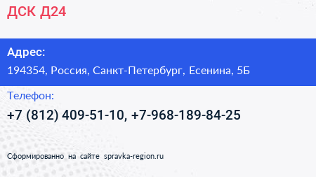 ДСК Д24 по адресу 194354, Россия, Санкт-Петербург, Есенина, 5Б в дальнейшем Организация, размещена в следующих категориях: