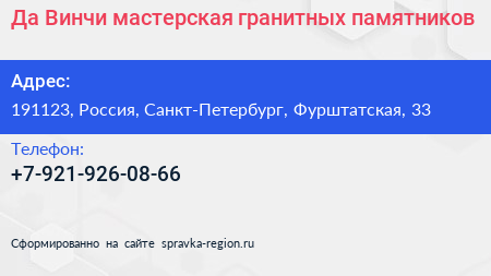 Да Винчи, мастерская гранитных памятников по адресу 191123, Россия, Санкт-Петербург, Фурштатская, 33 в дальнейшем Организация, размещена в следующих категориях: