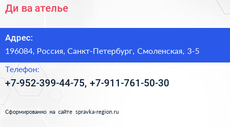 Ди.ва, ателье по адресу 196084, Россия, Санкт-Петербург, Смоленская, 3-5 в дальнейшем Организация, размещена в следующих категориях: