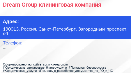 Dream Group, клининговая компания по адресу 190013, Россия, Санкт-Петербург, Загородный проспект, 64 в дальнейшем Организация, размещена в следующих категориях: